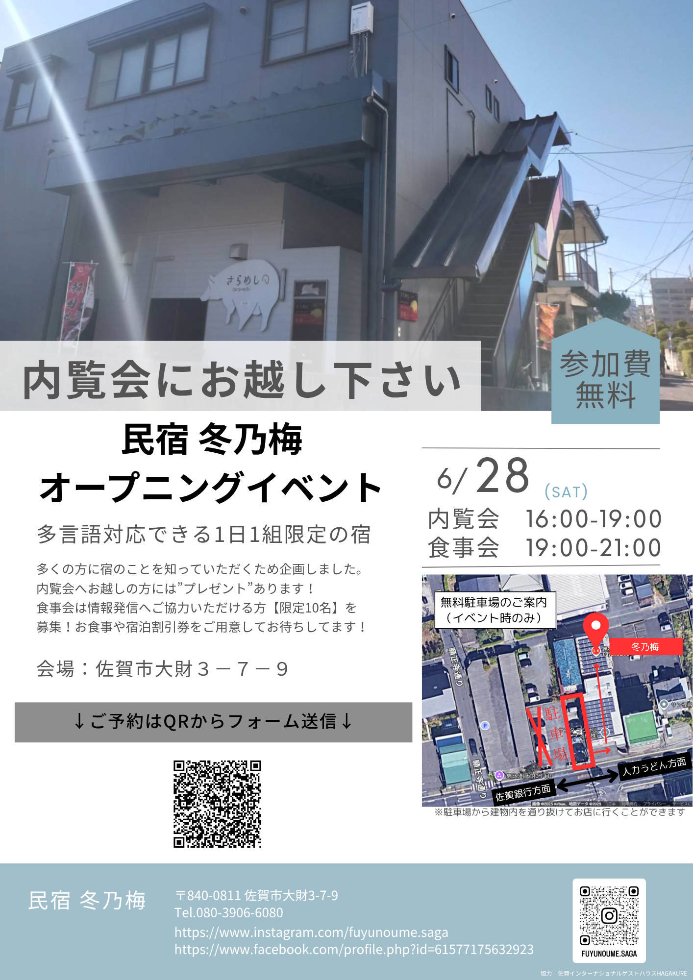 当ゲストハウスがオープン支援などサポートしているお宿(民宿冬乃梅)のオープニングイベントのお知らせです。