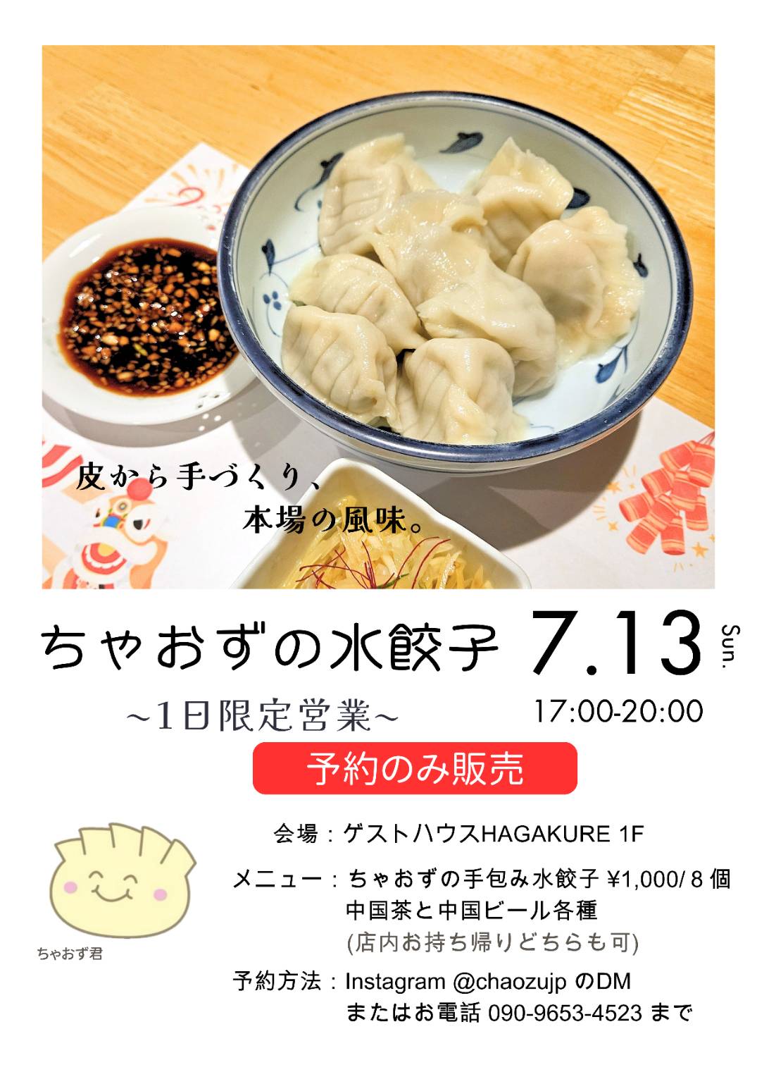 <イベントのお知らせ>ちゃおずの水餃子~1日限定営業~inゲストハウスHAGAKURE【主催:ちゃおず】